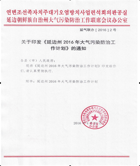 根据国务院《大气污染防治行动计划》、《吉林省落实大气污染防治行动计划实施细则》(吉政发〔2013〕31号)、《延边州大气污染防治行动计划实施方案》(延州政发[2014]7号)和州政府向县(市)政府下达的《大气污染防治目标任务书》(2014年),结合吉林省清洁空气行动,制定延边州2016年大气污染防治工作计划。